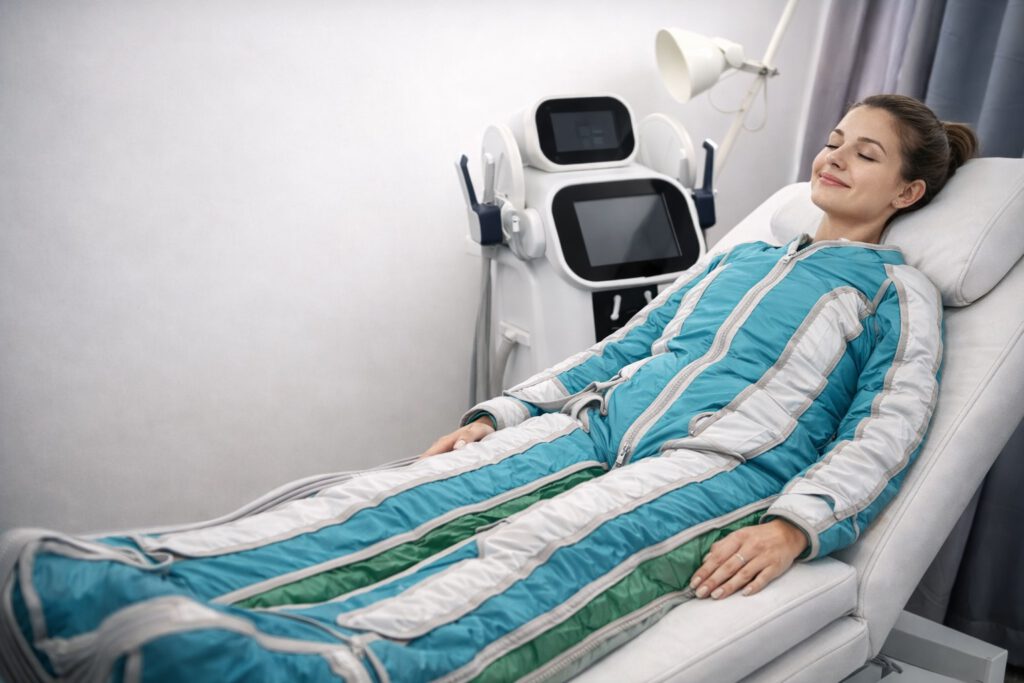 Die Behandlung erfolgt in einem speziellen Ganzkörperanzug, der mit sanftem, rhythmischem Druck arbeitet – je nach Bedarf auch mit zusätzlicher Infrarotwärme. Die angenehme Wärme kann die Behandlung zusätzlich unterstützen und zu einem entspannten, aktivierten Körpergefühl beitragen.